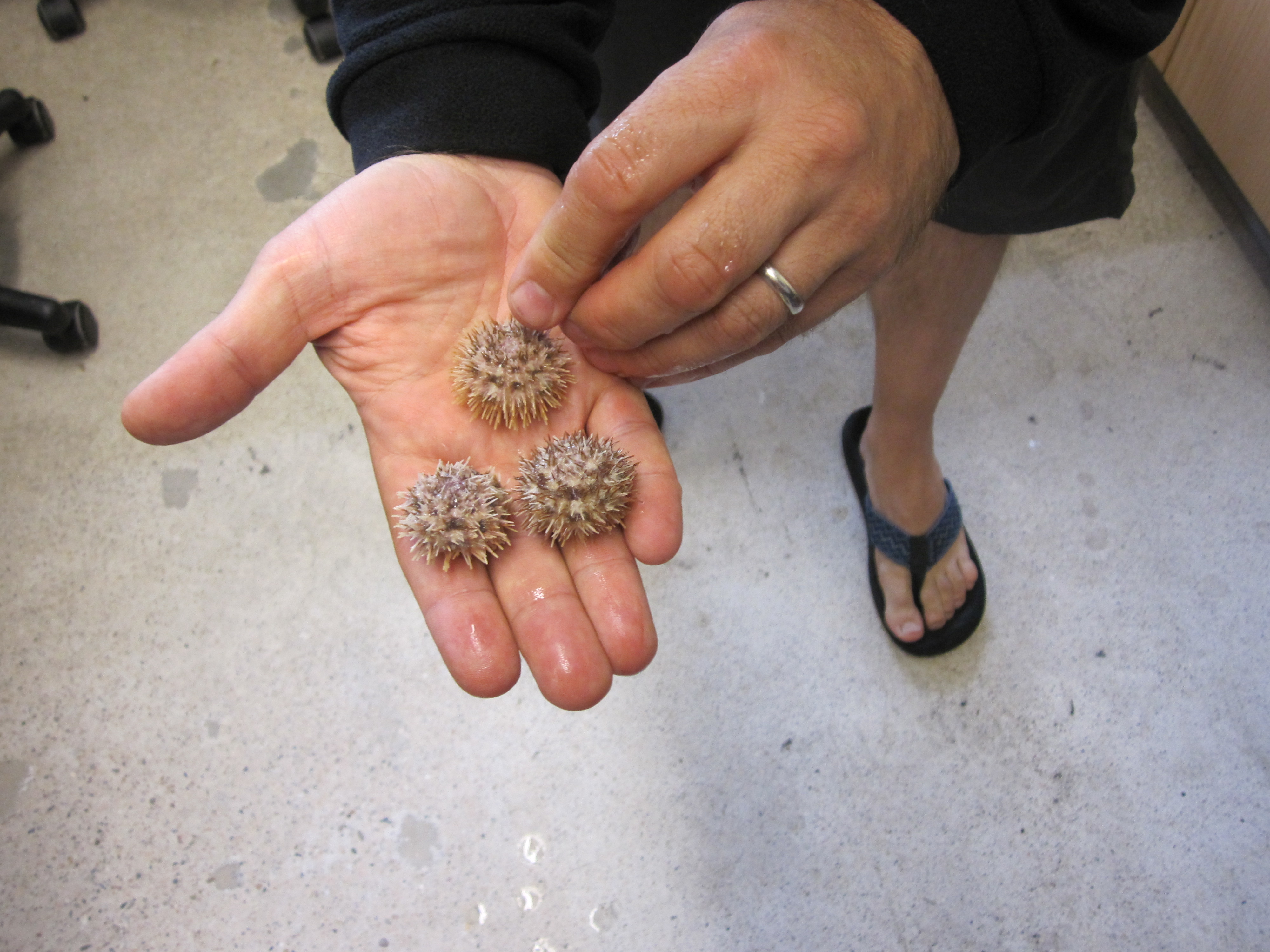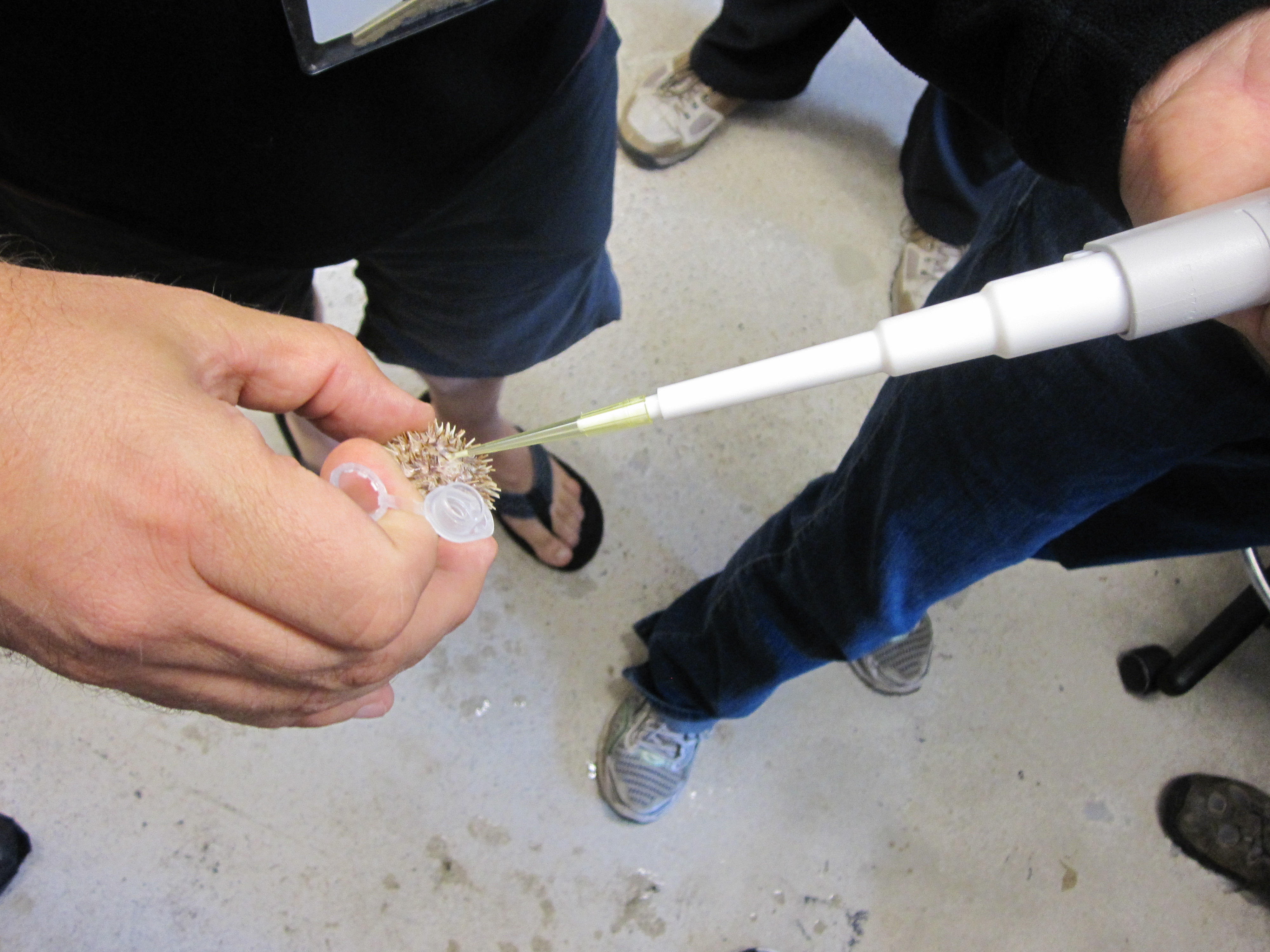 2. Turn the sea urchin upside down– which is mouth/butt side up– and inject a 0.5M solution of potassium chloride (KCl) into its body using a small sterile insulin syringe. The KCl relaxes the muscles around the gonads releasing their, ahem, contents (fun fact: KCl is one of the solutions used in lethal injections)