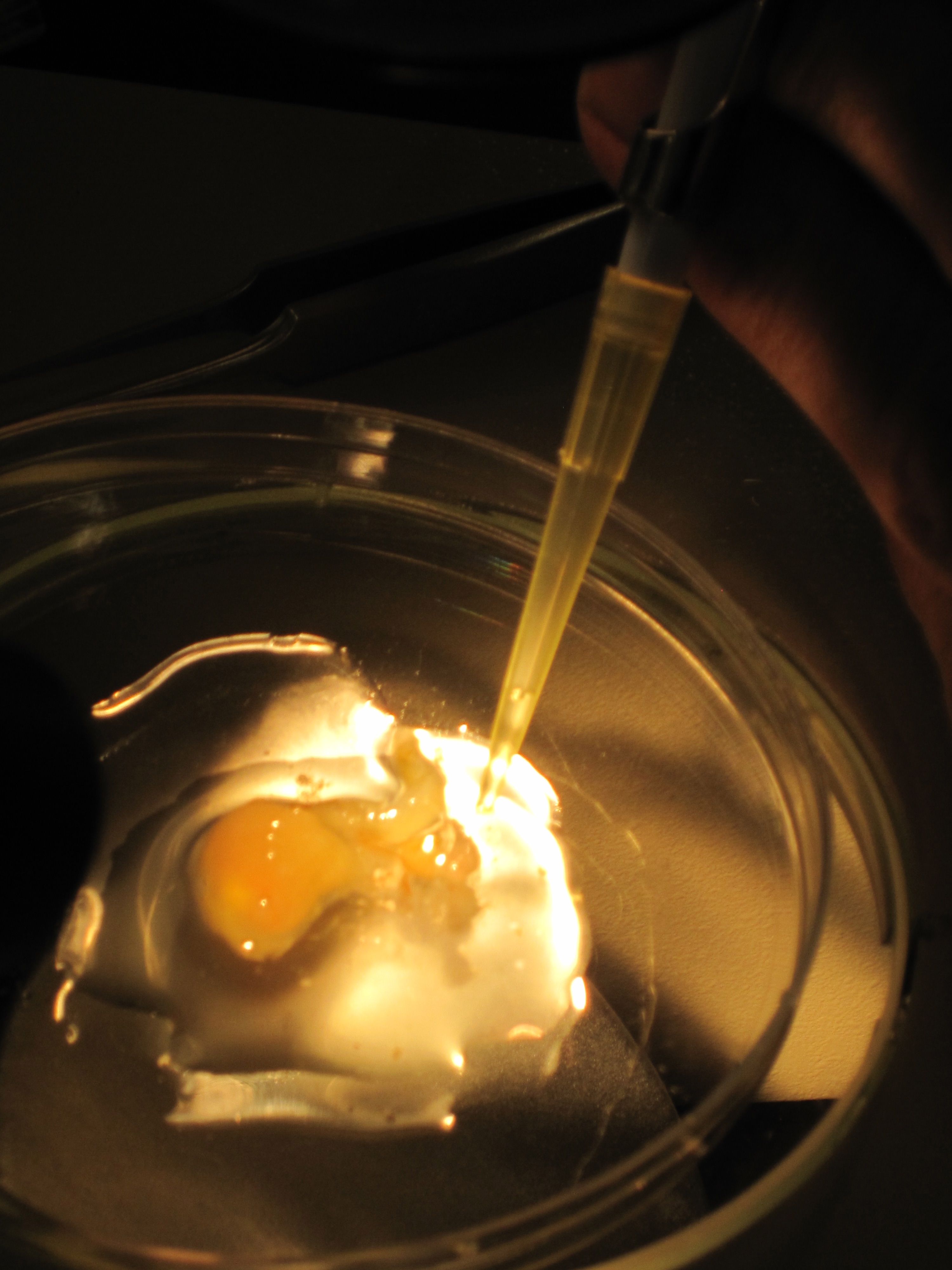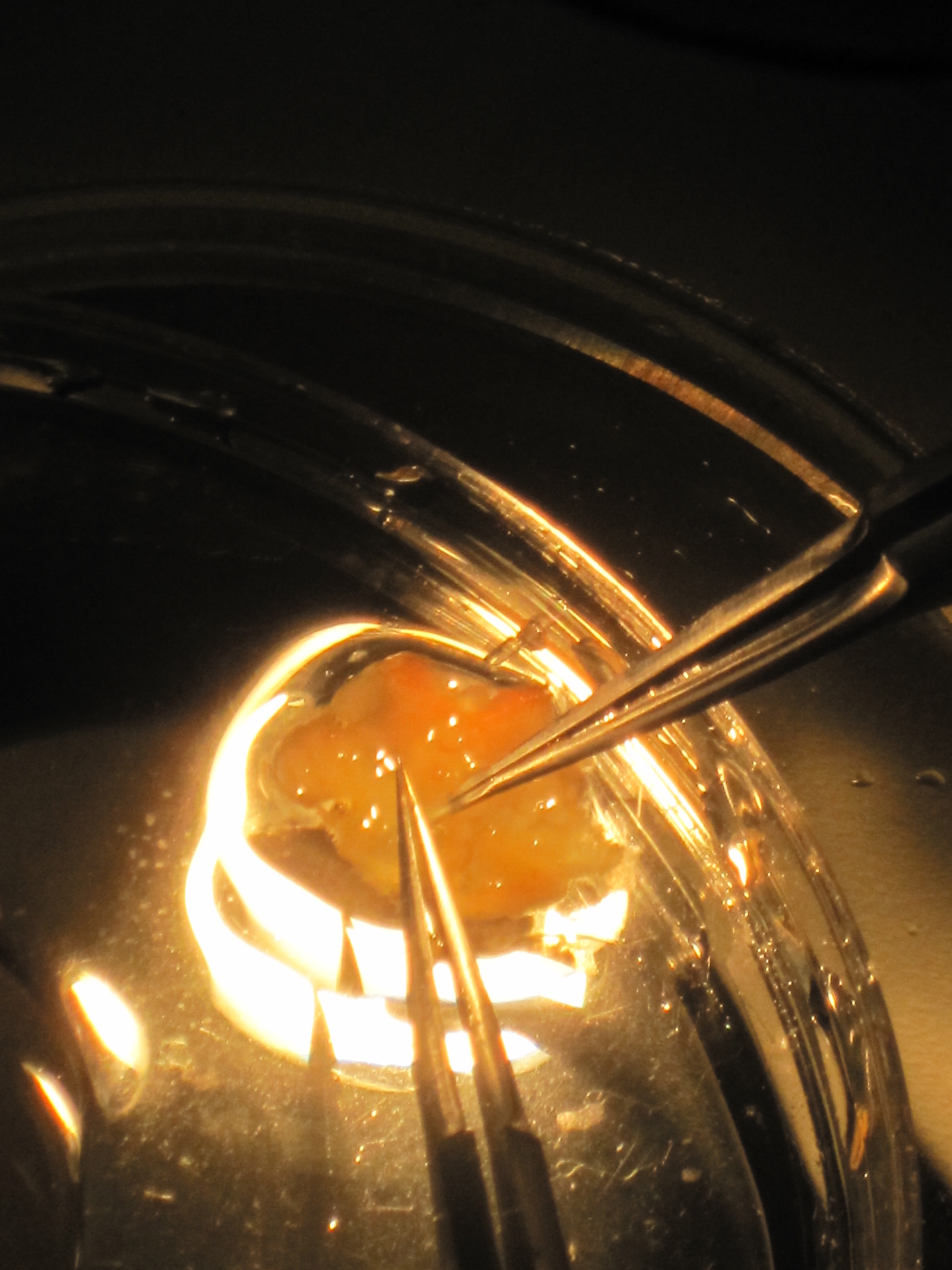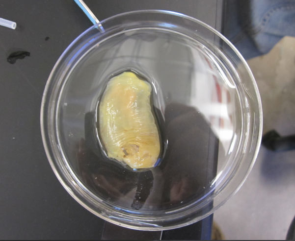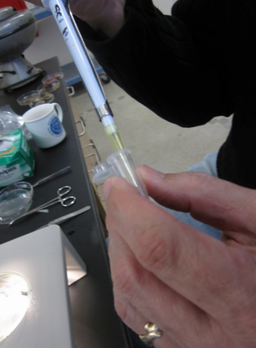 Next, we broke the sperm casing and pipetted as much as we could into an eppendorf tube, then mixed in some sodium hydroxide to get the boys swimming. We peeked at them under the scope, but they don’t photograph well so you’ll have to use your imagination (envision grains of black pepper swimming and you’re almost there).