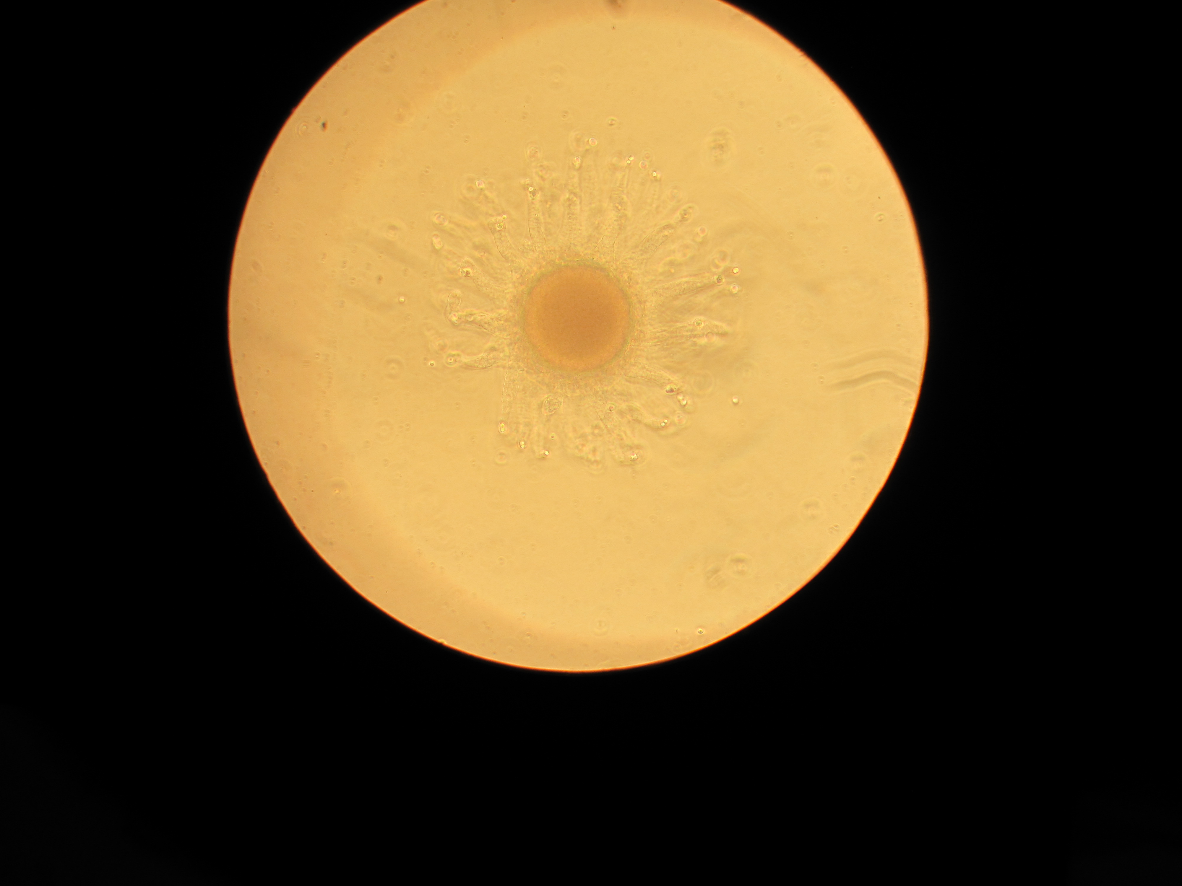 We mixed the sperm and eggs from two separate tunicates together in a dish, because although they have all the equipment to go at it alone, they prefer to dance with a partner (likely to generate a more diverse and robust population). A few hours later, the fertilized eggs had blossomed into 16-cell embryos. Here is what they looked like under the microscope.