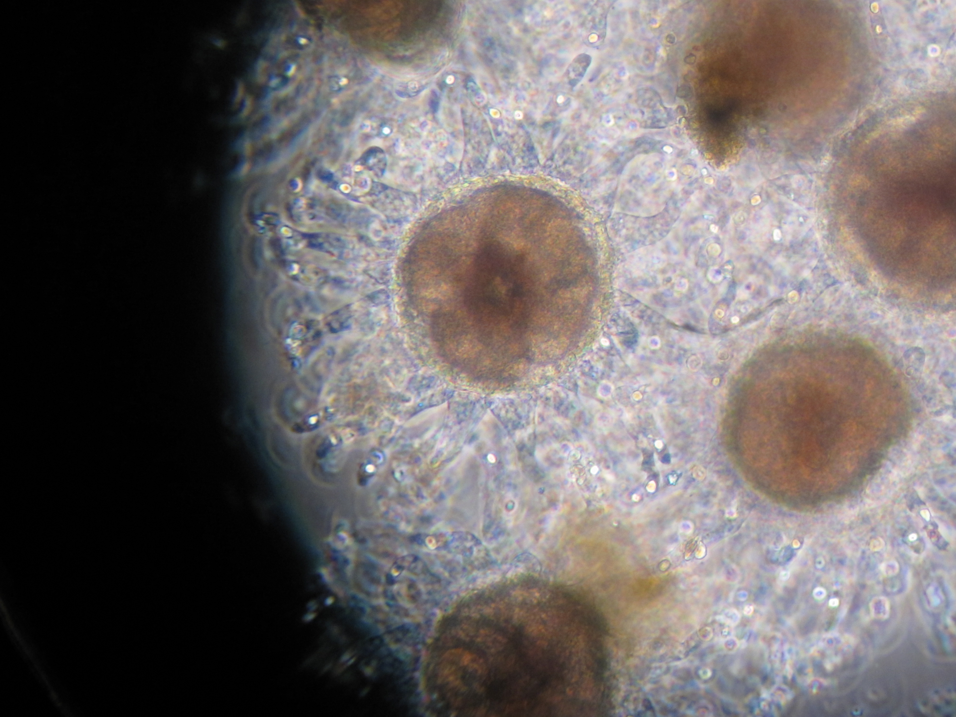 Then, we checked the eggs under the microscope. They looked like a child’s drawing of a sun; the rays are actually cilia, or hair-like structures, which help protect the egg.