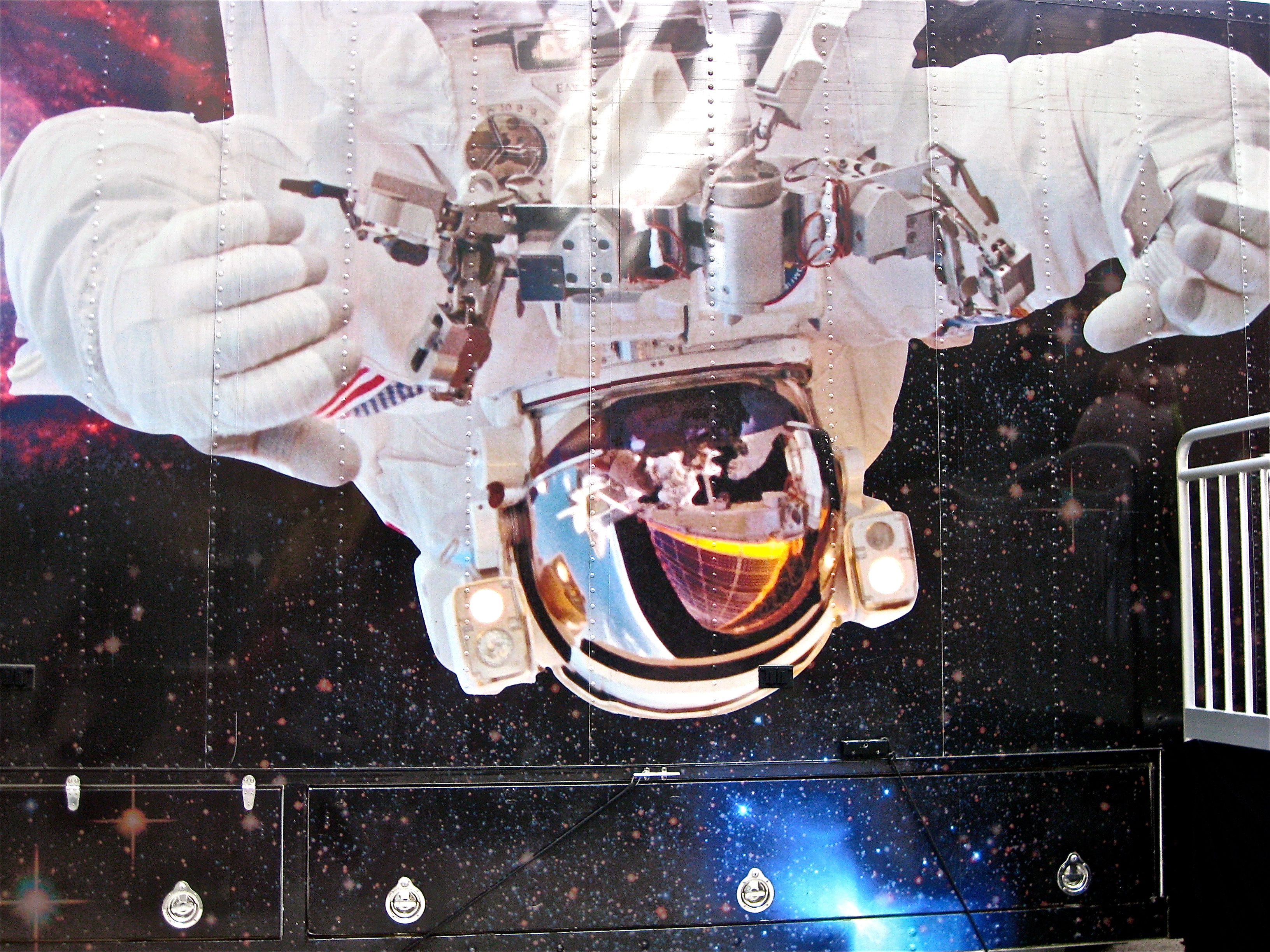 I stopped by the Eventi Hotel’s garden in Chelsea earlier today to attend a NASA educational event. Four astronauts from the final Atlantis shuttle mission were there (sadly, didn’t meet them) as was the real Elmo from Sesame Street (we also did not meet). The event’s goal was to boost public interest in NASA and space exploration through interactive exhibits, including iPhone-controlled robots from NYU-Poly’s mechatronics department, models of Mars rover parts from Honeybee Robotics and live play on NASA’s Moonbase Alpha video game, which was projected high on one of the garden’s walls. But, what really caught my eye– just as it did during a family trip to the Cosmosphere and Space Center in Hutchison, Kansas circa 1990–was an exhibit of astronaut food. Go figure. Here are a few of those magical, dehydrated treats, along with some other odds and ends:
