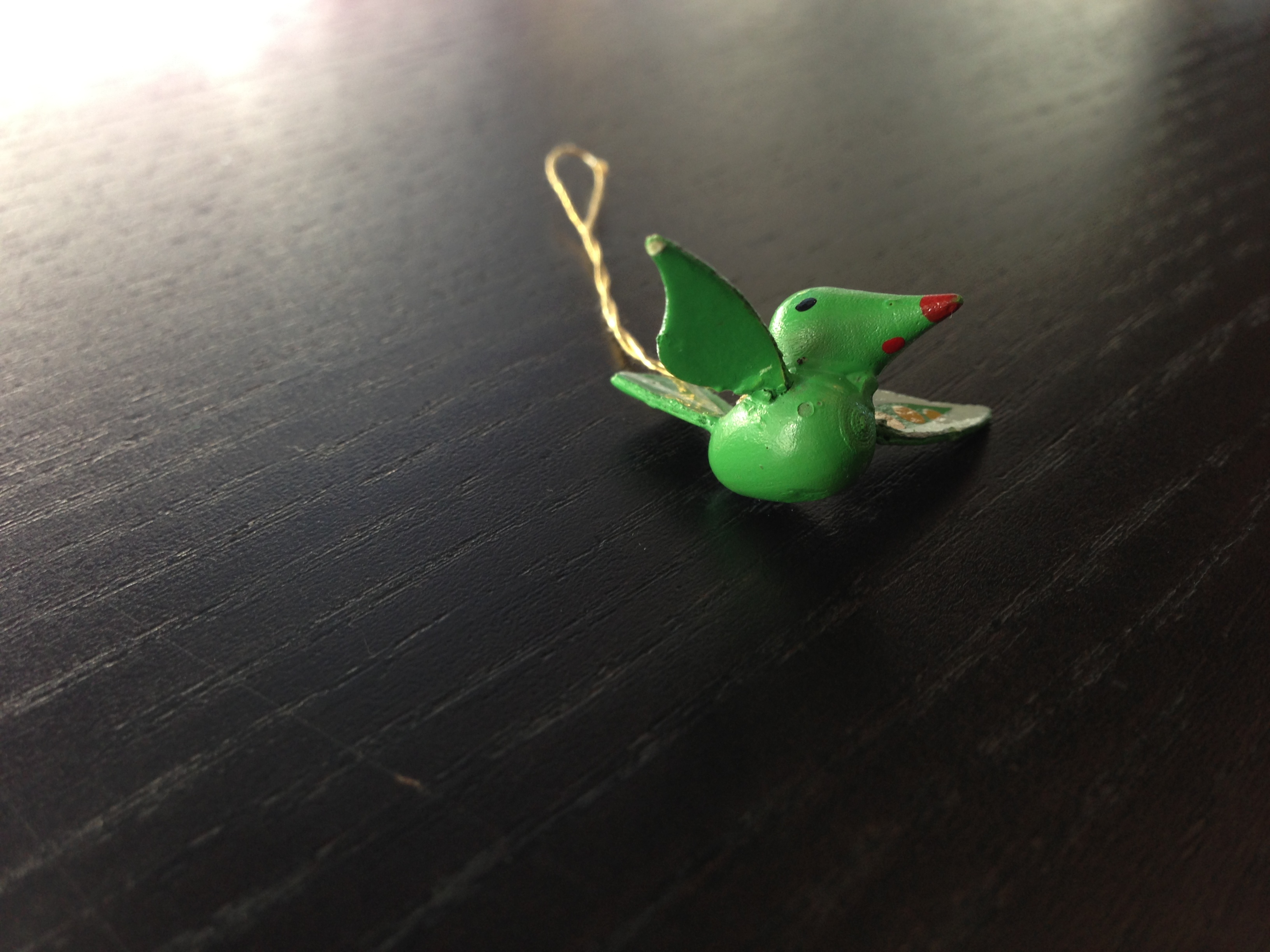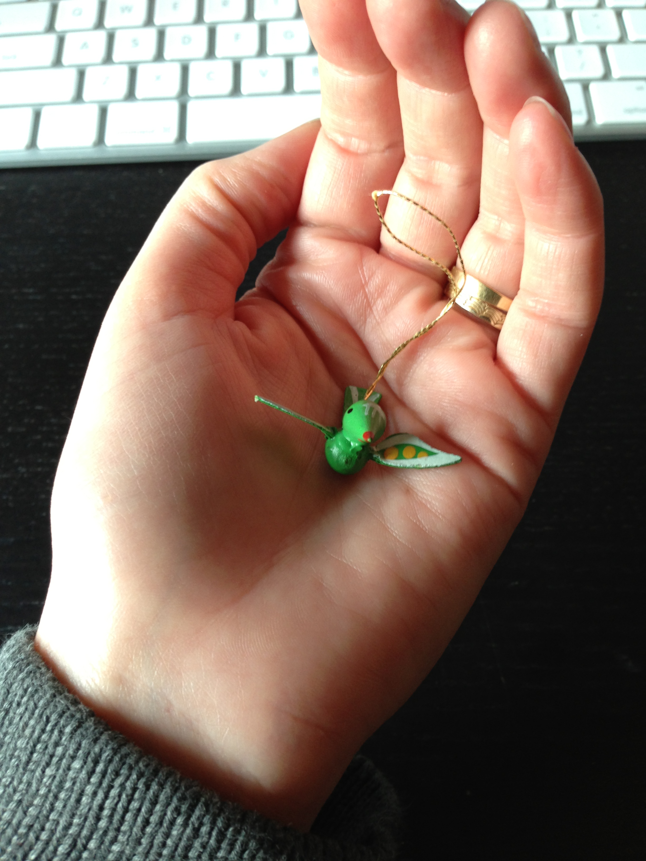 On an early walk, as my dog lifted his leg on the eighth tree of the morning, I saw a tiny ornament clinging to its lowest branches. It was a green bird about the size of my thumbnail with black eyes, a small dot of red paint under its beak that looked almost like a smile, and yellow and white patterns running down its outstretched wings. Despite the smile, the bird looked so sad, forgotten there in the trash pile.